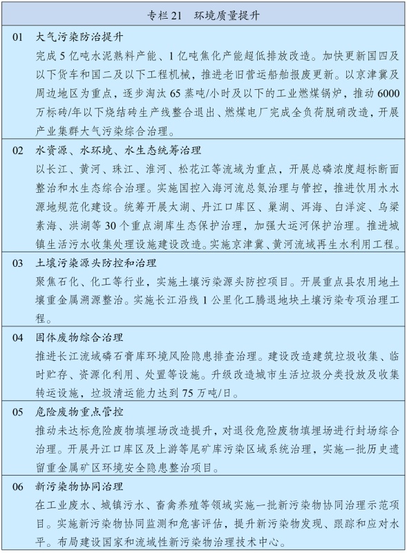 持续深入推进污染防治攻坚,以更高标准改善大气、水、土壤环境质量。以京津冀及周边、长三角、汾渭平原等重点区域为主战场,强化细颗粒物(PM2.5)控制,深入推进重点行业超低排放改造,推动挥发性有机物源头替代和全流程治理,制定下一阶段机动车排放和油品质量标准,深化大气环境绩效分级管理,氮氧化物、挥发性有机物排放量分别下降8%以上,进一步消除重污染天气。加强长江中游、成渝等区域大气污染防治。加强餐饮油烟、恶臭异味和环境噪声污染治理。统筹水资源、水环境、水生态治理,以解决全流域和跨省界突出问题为重点,加强重要江河湖库系统治理和生态保护,基本完成重点流域海域入河入海排污口排查整治,化学需氧量、总磷排放量分别下降6%,巩固城市黑臭水体治理成效、基本消除县乡黑臭水体。加强土壤污染源头防控,推进受污染耕地、建设用地安全利用。